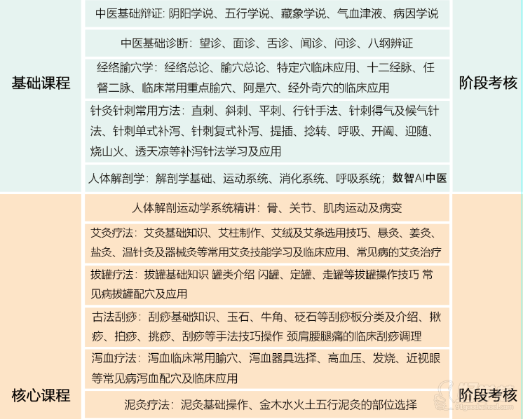 中医医疗辅助班其主要内容为经络、腧穴、刺灸法与治疗四个方面。本学科的教学目的,是使学生能系统掌握经络、腧穴理论、刺灸操作技能、针灸治疗的理、法、方、穴、术(即辨证论治的全过程)。对一般常见病、多发病以及部分急症能熟练地进行正确处理,针灸治疗学的学习要求学生在扎实掌握基本知识的同时,结合临床见习、实习,提高临床诊疗思维,能运用中医、针灸的理论和技能分析问题、解决问题。