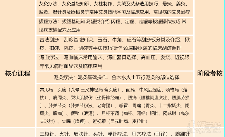 中医医疗辅助班其主要内容为经络、腧穴、刺灸法与治疗四个方面。本学科的教学目的,是使学生能系统掌握经络、腧穴理论、刺灸操作技能、针灸治疗的理、法、方、穴、术(即辨证论治的全过程)。对一般常见病、多发病以及部分急症能熟练地进行正确处理,针灸治疗学的学习要求学生在扎实掌握基本知识的同时,结合临床见习、实习,提高临床诊疗思维,能运用中医、针灸的理论和技能分析问题、解决问题。