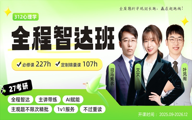 27 考研心理学硕士 312 心理学专业基础全程智达班,以 “全周期科学规划” 为核心,提供从 2025 年 9 月至 2026 年 12 月的长线备考支持,通过多阶段课程、专属服务与 AI 赋能,助力考生高效备战,解决备考周期长、内耗多、学习无章法等问题,课程定价 7980 元,还含 “不过重读” 。