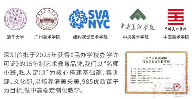 深圳首批于2025年获得《民办学校办学许可证》的15年制艺术教育品牌,我们以“名师小班,私人定制”为核心搭建基础部、集训部、文化部,以培养清美央美,985优质苗子为目标,做中高端定制化教学。