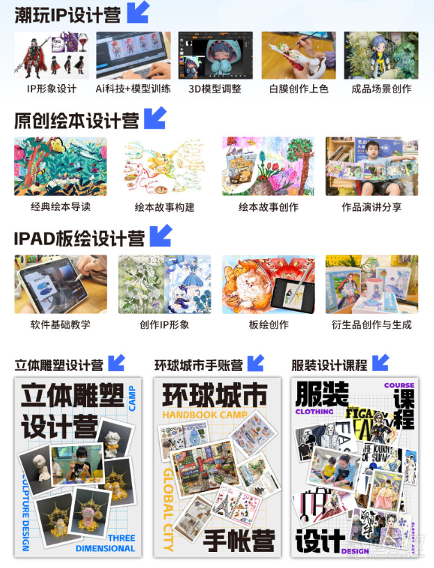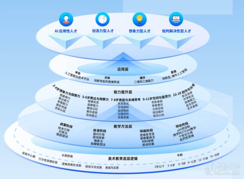 以年龄分层为线索,有机融合「艺术+文化+科创」元素,精心打造阶梯式成长路径,着重培养学员的审美能力、创造力以及升学竞争优势。