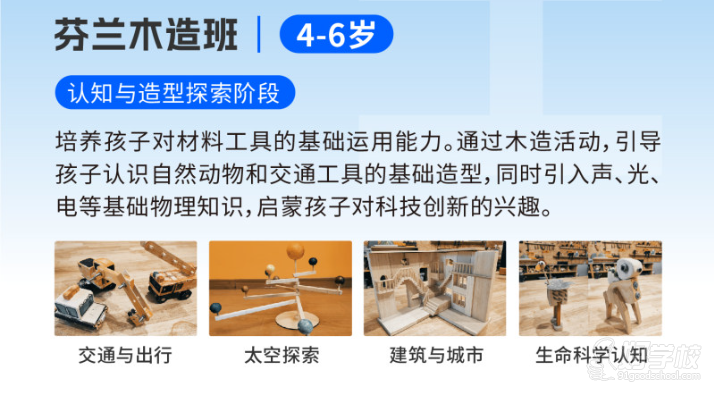 课程以木造活动为载体,循序渐进引导孩子掌握锯、粘、拼、贴等基础工具使用方法,锻炼手部精细动作与手眼协调能力。课堂围绕四大主题模块展开:在交通与出行主题中,孩子将动手制作汽车、起重机等木质模型,认识交通工具的结构与功能;在太空探索主题里,通过搭建行星仪、火箭模型等,初步感知宇宙天体与力学原理;在建筑与城市主题中,尝试搭建房屋、楼梯等结构,理解空间布局与建筑美学;在生命科学认知主题下,制作动物造型木作,探索生物形态与生命特征。
