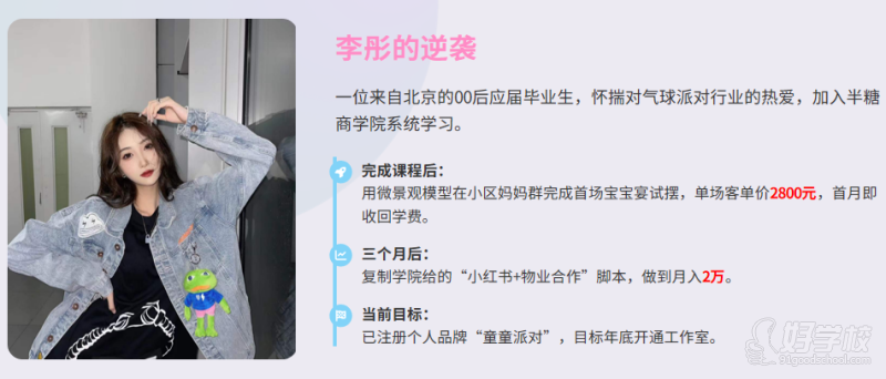 半糖派对商学院开创了新的派对培训模式,注重以学员的盈利为宗旨,多对一带着学员从零开始创业。从前期选址、推广、开业活动到谈单、接单、拓客、异业合作等,学校都将提供可落地的策划方案及方法。并及时复盘调整,学员可以拿到结果。本校独创了派对微景观差异化的工具性产品,助力学员有效推广市场和有效获客,比如用来打造展柜、异业联盟、直播、沙龙活动、社区活动等等,学校将终身指导学员拓展和实施方案。