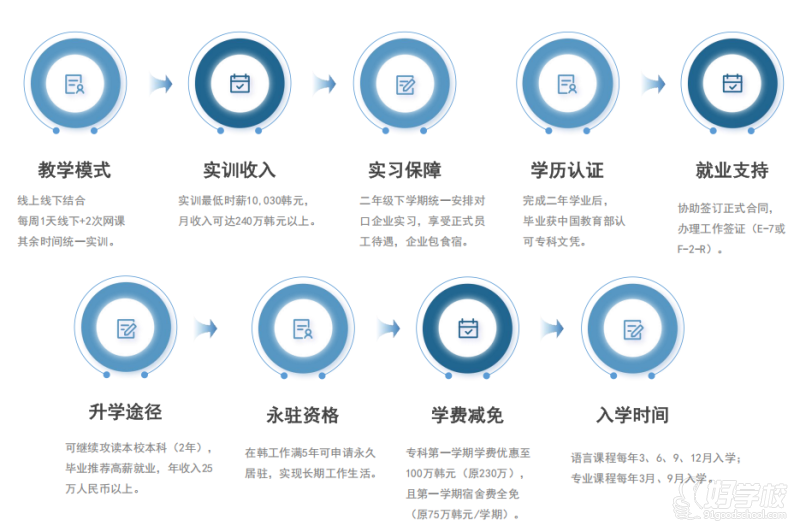 4. 推荐就业:学校负责向毕业生推荐韩国企业就业机会在韩国工作五年后可获得韩国永驻资格。