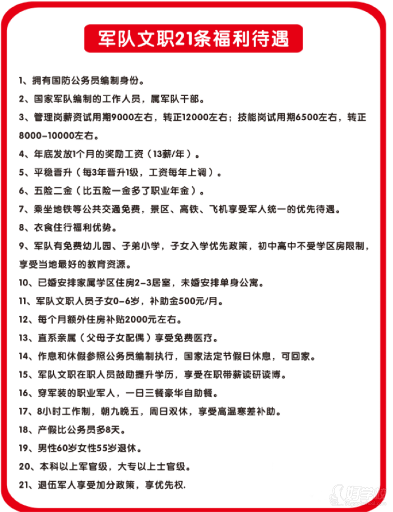 2. 薪资待遇高:军队建立统一的文职人员工资制度。技能岗月薪高达7500左右,管理岗、技术岗 月薪高达9000-11000,每年13薪。收入一般为公务员的1.5-2倍左右。