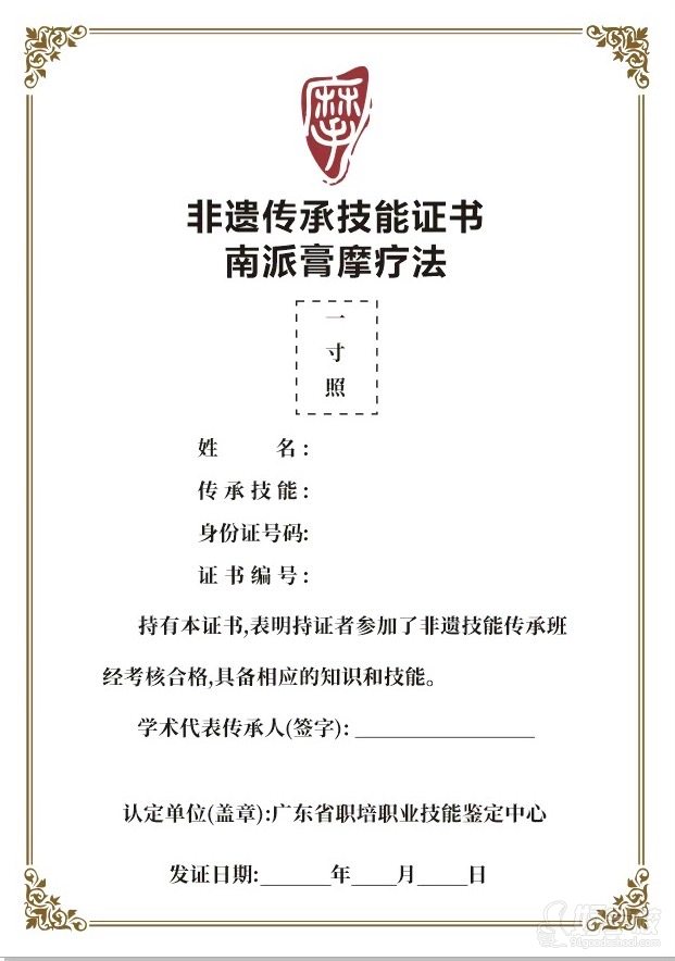 (1)证书加持:考核合格可获权威凭证——可加入广东省传统医学学会南派膏摩疗法学会专委会成员身份、颁发非遗传承技能证书。