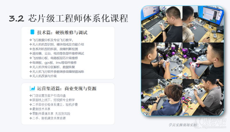 以芯片级维修为核心,培养能独立上岗的无人机技师