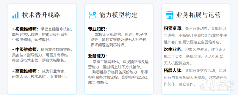 - 多元变现:课程融合运营教学,覆盖维修接单、二手买卖、配件销售、无人机租赁等多元业务,助力学员实现多重商业变现。