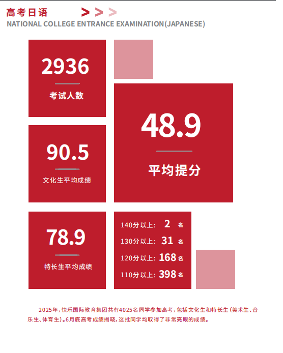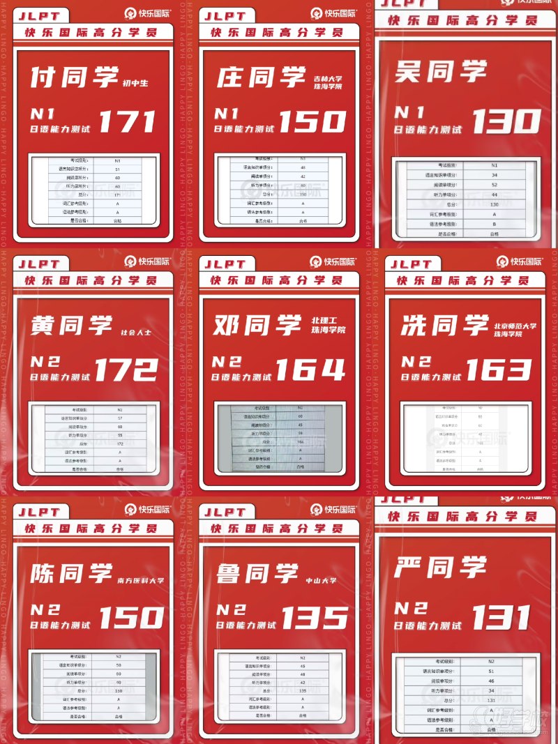 近年来,快乐国际语言中心与早稻田大学、同志社大学、北京日本学研究中心、华南日语研究所等学术机构,以及广州丰田、CASIO(上海)、珠海佳能、麒麟啤酒、紫翔电子等着名在华日资企业建立了广泛的联系,并与东京国际日本语学院、修曼日本语学校、日中文化交流中心、嘉华世达出国留学机构等建立了深度合作关系。优质的教学质量和有机的资源整合,为广大同学的国内升学、海外留学、名企就业铺平了道路。