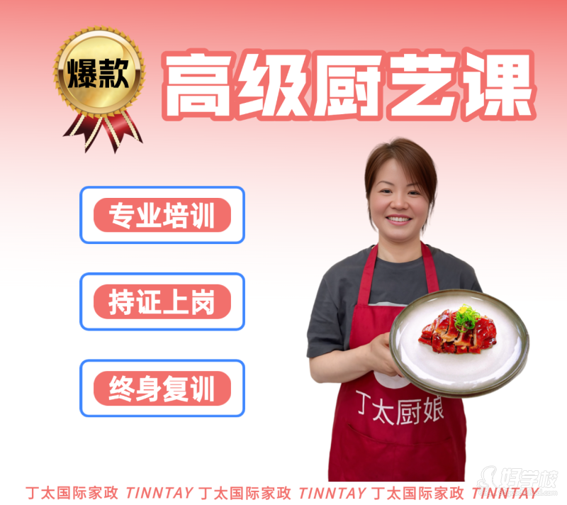 高端家政服务人员必备技能——高级厨艺。以酒店厨艺的操作理念,改良适合家庭厨艺的操作步骤,力求将家庭厨艺达到酒店的水准。高级厨艺以江浙沪菜系为主,其他各大菜系为辅,教授经典名菜、融合创新菜肴等中式菜品,以及教授西餐、烘焙、海鲜、中式面点、营养学、高端食材烹饪方法、普通食材高端做法、摆盘等。丁太高级厨艺课,由资深厨艺讲师大陈老师亲自授课,理论、实践相结合,老师主导演示,学员跟随实操,实操内容贴合各阶段家庭的实际需求,由基础到高端,循序渐进。如果你有高端家政服务需求,关注丁太,把家交给我们,你去享受生活。