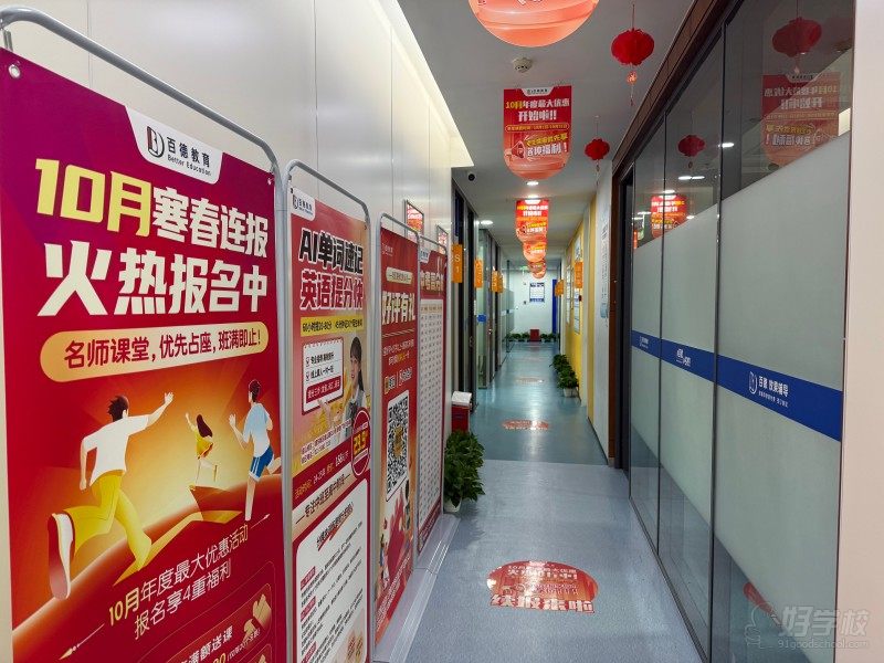 百德教育的教学环境整洁明亮:走廊规划有序,配备独立洽谈室方便沟通;教室分设不同规模,既有适合小班互动的空间,也有容纳多人的大班教室,桌椅摆放规整;墙面设有光荣榜展示学员成绩,既显学习氛围,也能给学员正向激励;前台区域布置温馨,整体环境清爽舒适,能为学习提供不错的场地支持。